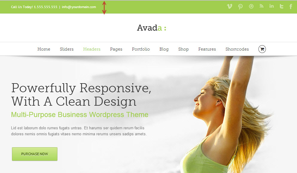 When you using Header style #5. And If you want to change the green bar height. Like this picture. And Avada theme version is 3.1.1