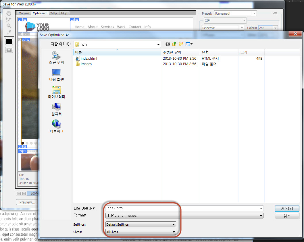 (File / Save for Web에서 아래 세팅으로 저장. 이 세팅은 테이블로 만들어 준다)
