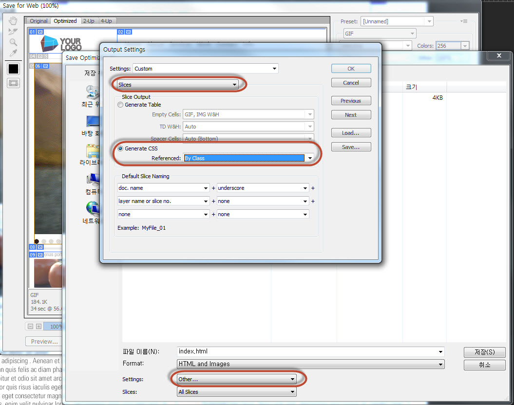 (혹은 아래처럼 하는데 우선 Setting : Other…를 선택한 후 나머지를 그림 처럼 선택. div와 css로 저장됨. 여기서는 이 방법을 사용. 5번 처럼 테이블로 안함.)