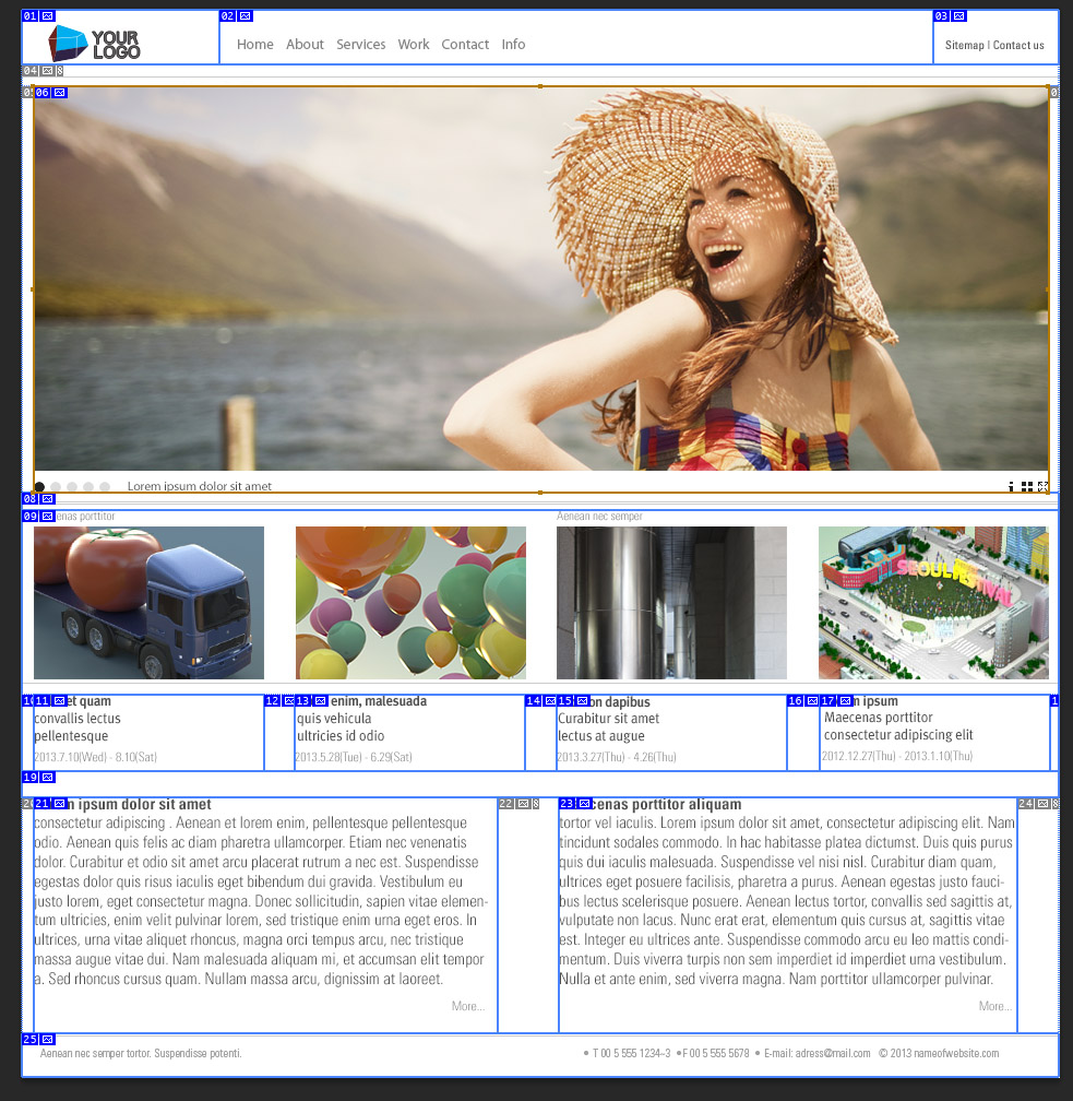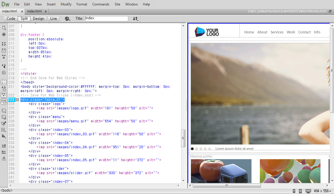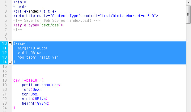 This is final look. I made it with photoshop. Main image that I bought in istock. (메인 페이지 만들기. 웹 표준에 맞는 나은 방법이 있으나, 저는 이 방법으로 html, css 코딩을 최소화하여 쉽게 만들었습니다. 물론 사이트 규모가 커지거나 한다면 체계적으로 만드는게 좋겠지요. 이 방법은 목업이나 시작점으로 활용하는게 좋을 것입니다. 프리뷰 링크 1. structure preview Adobe CC dose not support spry anymore, but I gonna use it anyway. But this looks good. CSS Menu Maker. 2. Design your main page. I made 951 x 978 document size. 3. With ‘Slice Tool’ slice the elements. 4. I sliced like this. 5. File / Save for Web. With this settings. It will make table structure. 6. Or you can use this setting to avoid table. 7. If you preview the index.html, the all contents are align left. 8. To align center, open index.html file in Dreamweaver. (or other text editor) 9. Add this code in front of <div class=”Table_01″> 10. Add this close code right after last </div> 11. Add this code in css. 951px is document’s width. 12. You can see the contents align center. 13. You can download the last html file at part3
